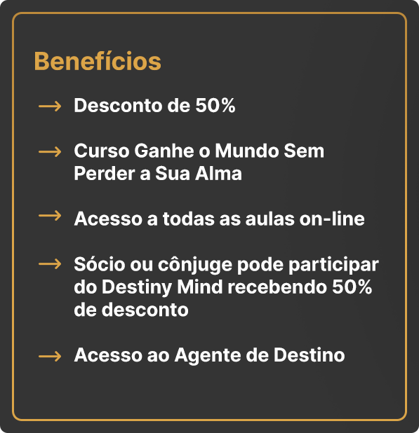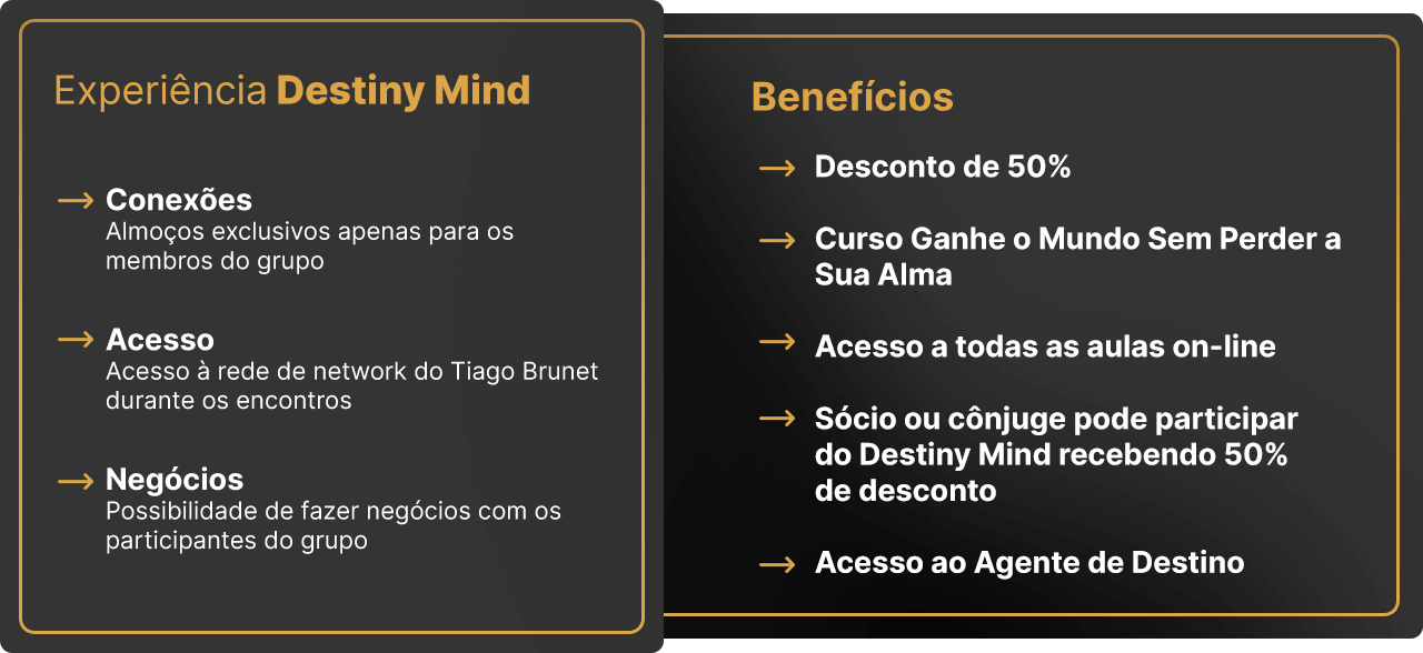 Um programa de 12 meses com Tiago Brunet, onde você terá acessos a 5 encontros presenciais e 3 via Zoom. Um ambiente que vai te proporcionar conhecimento, network e ferramentas que vão potencializar seus resultados, através de uma experiência imersiva.
